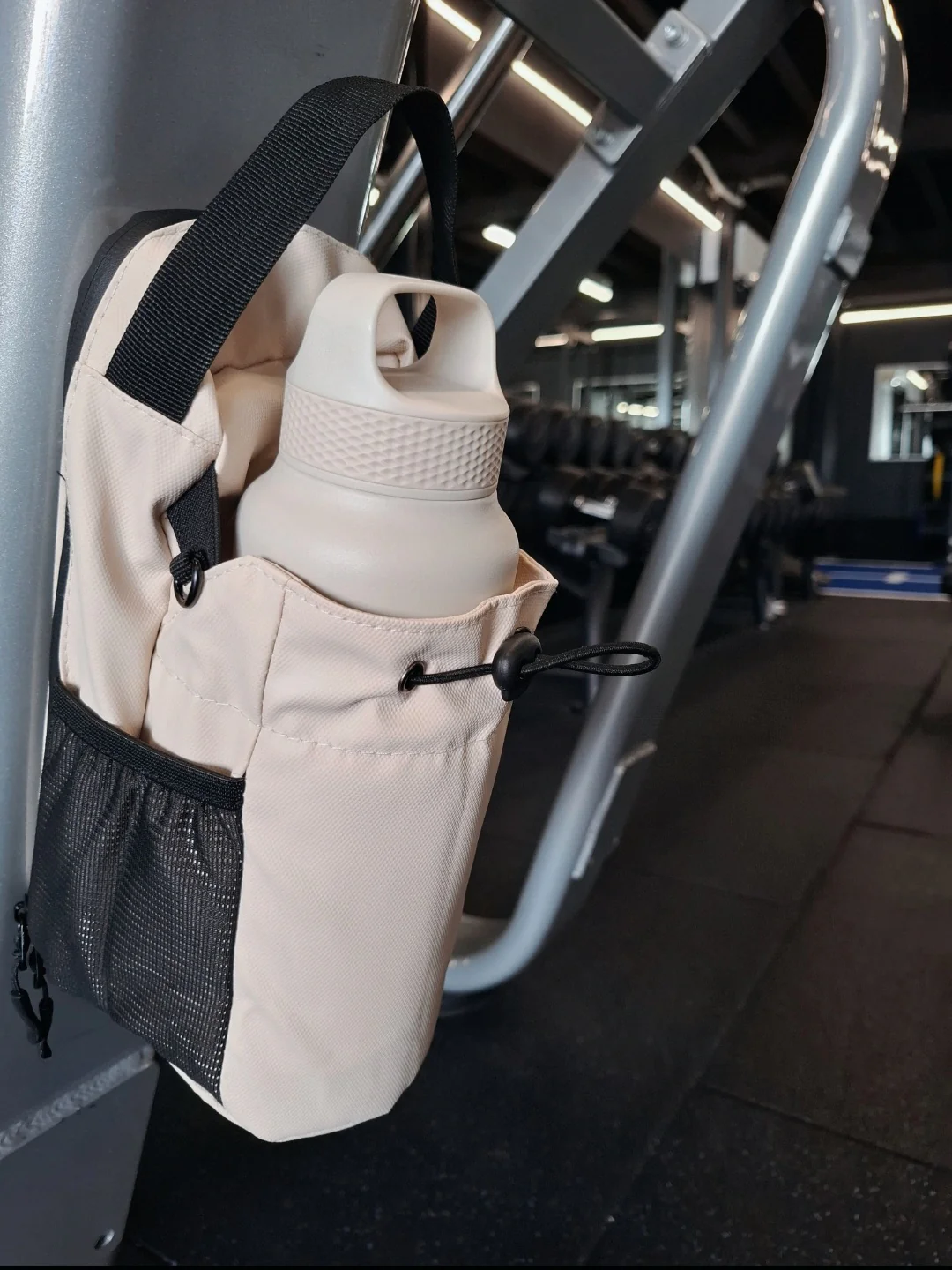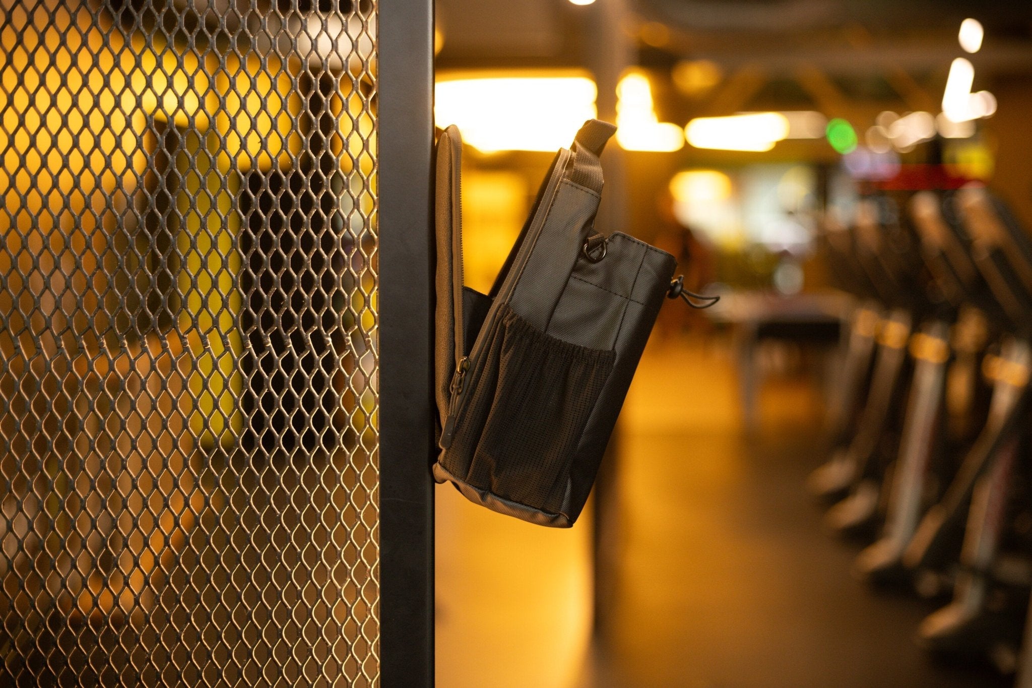 The main pocket holds your essentials, there's a separate bottle sleeve, and a hidden AirTag pocket so you can track your bag. Everything has a spot, so you're not digging around between sets.
